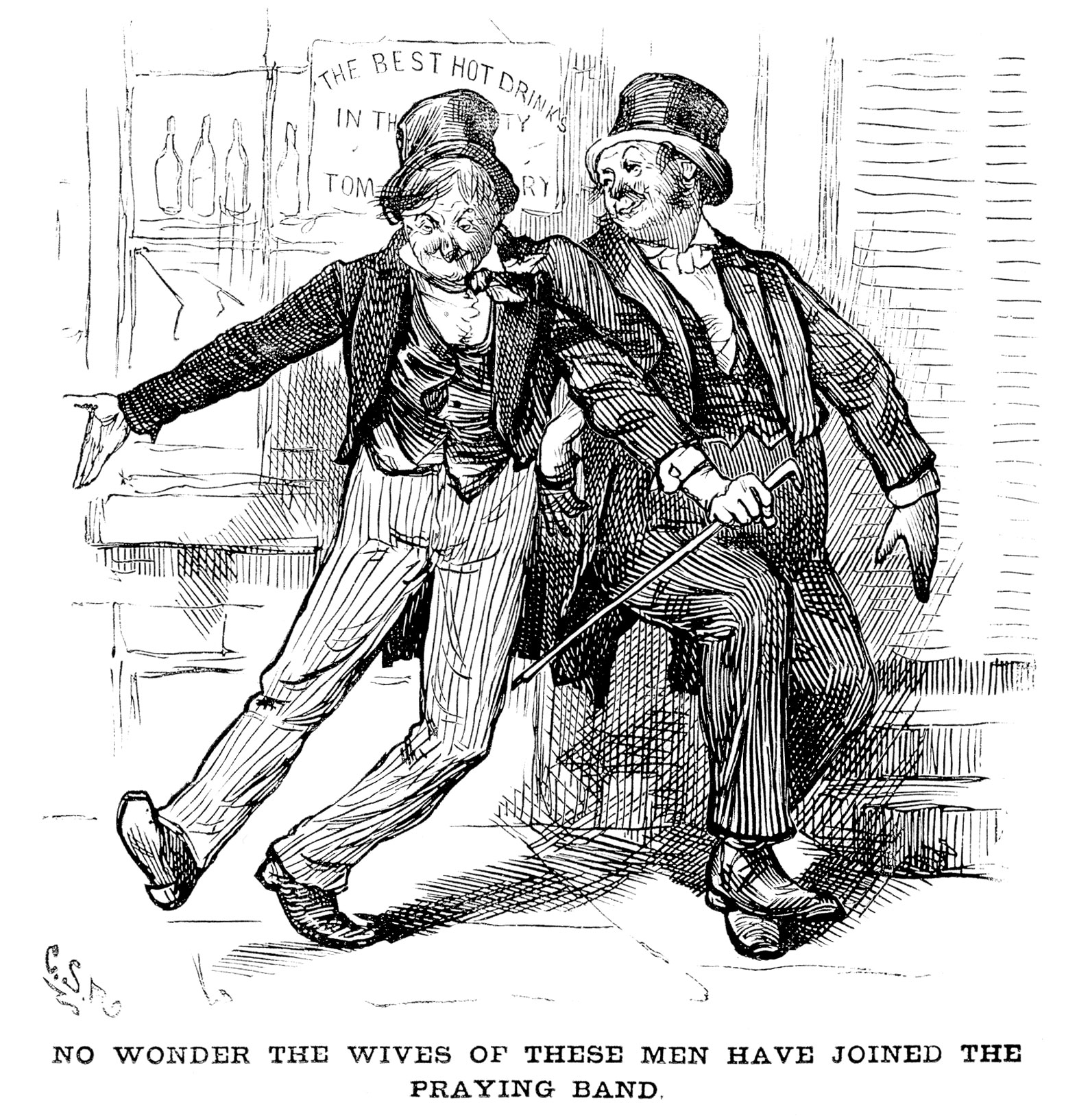 The illustrator of this picture, is anonymous, however it is clear they had a good understanding of the temperance movement by their interesting cartoon. This source is trustworthy because it was found through one of the many safe databases found in the School's library and media folder on Edline. I used this database while working on a research project last year, so I know that the information is believable and correct. When this document was produced, America was going through many struggles. People in our country were drinking excessively leading to very dangerous behavior. Men would beat their wives and children when they were drunk. This cartoon shows two drunk men, it shows the affect of these men on their families. It shows that these men were so horrible ton their families that it was obvious that they would be drawn to God for help The illustration gives an accurate representation of drunk men in the 19th century, however it doesn't show how horrible these men were. The author sides with the families of these drunk men. The illustrator is in favor of the Temperance movement because the men who are drunk are useless, as you can see in the picture. The illustrator of this cartoon would be satisfied with the U.S. now, compared to the mid 19th century.